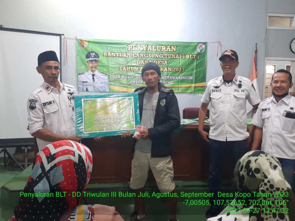 BLT DD Bulan Juli .Agustus septemberTahun 2023 telah disalurkan oleh Pemerintah Desa Kopo kepada 39 KPM (Keluarga Penerima Manfaat). Setiap KPM masing-masing menerima bantuan sebesar Rp.900 ribu rupiah